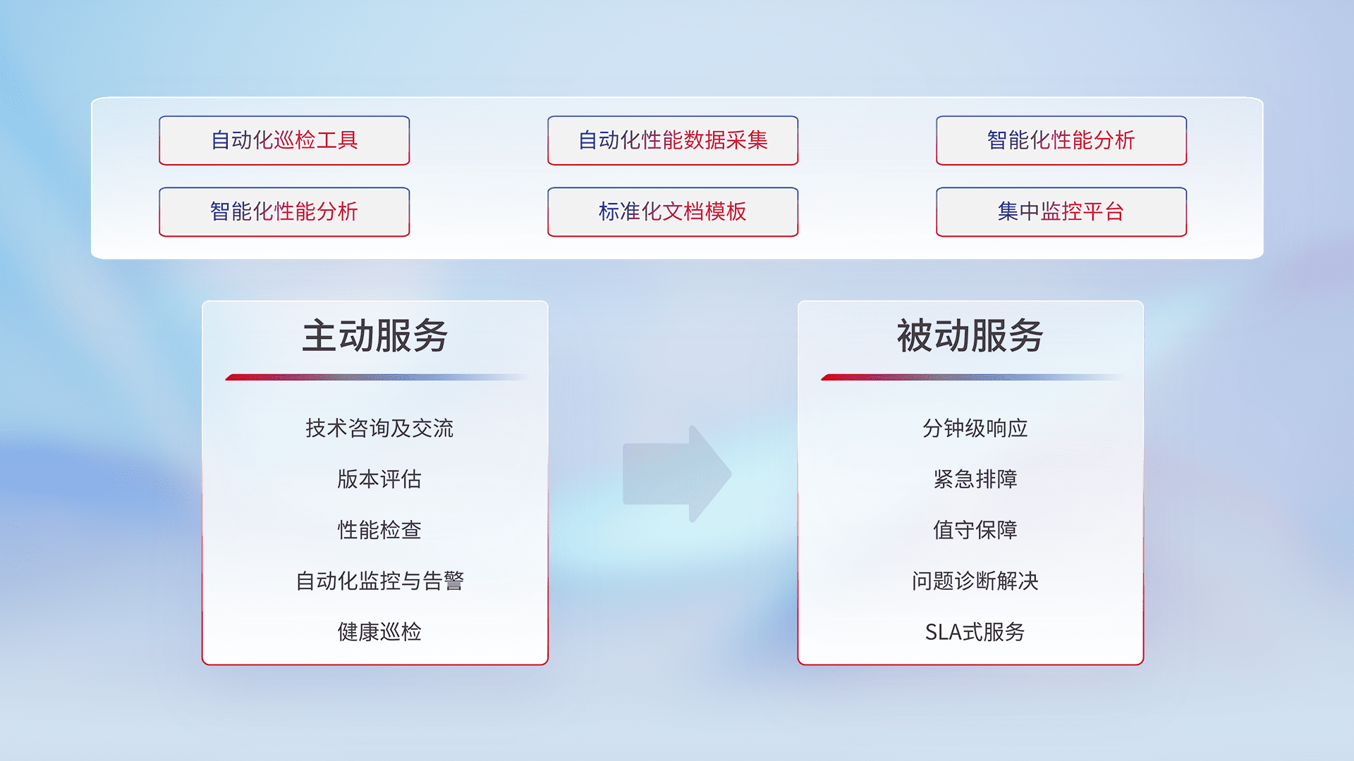 智能化工具和标准化文档,,保障服务质量,,,提供主动服务(包含技术咨询、、、、版本评估、、性能检查、、自动化监控与告警、、健康巡检)和被动服务包含(分钟级响应、、、紧急排障、、值守保障、、、、问题诊断解决、、、、SLA服务)。。。